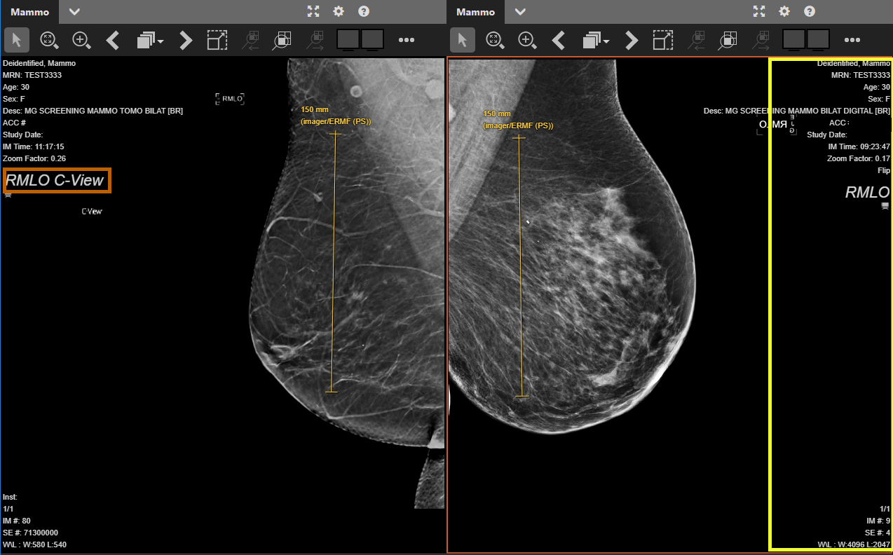 Orientation marker The orientation marker is always shown opposite the chest wall and it cannot be turned off. If C-View (Hologic : Synthesized 2D Mammographic Imaging) is present, it is added to the orientation marker so that the user is always aware that they are viewing a synthesized image (for example, RCC C-View). The orientation marker is outlined in orange in the above image. |